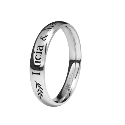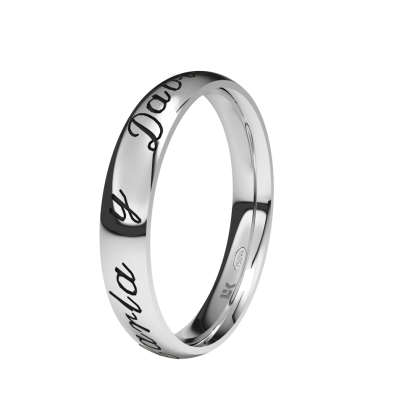 Alianza de boda de oro personalizadas con forma media caña con 3 50 mm de ancho letra normal. disponible en blanco y Rosa